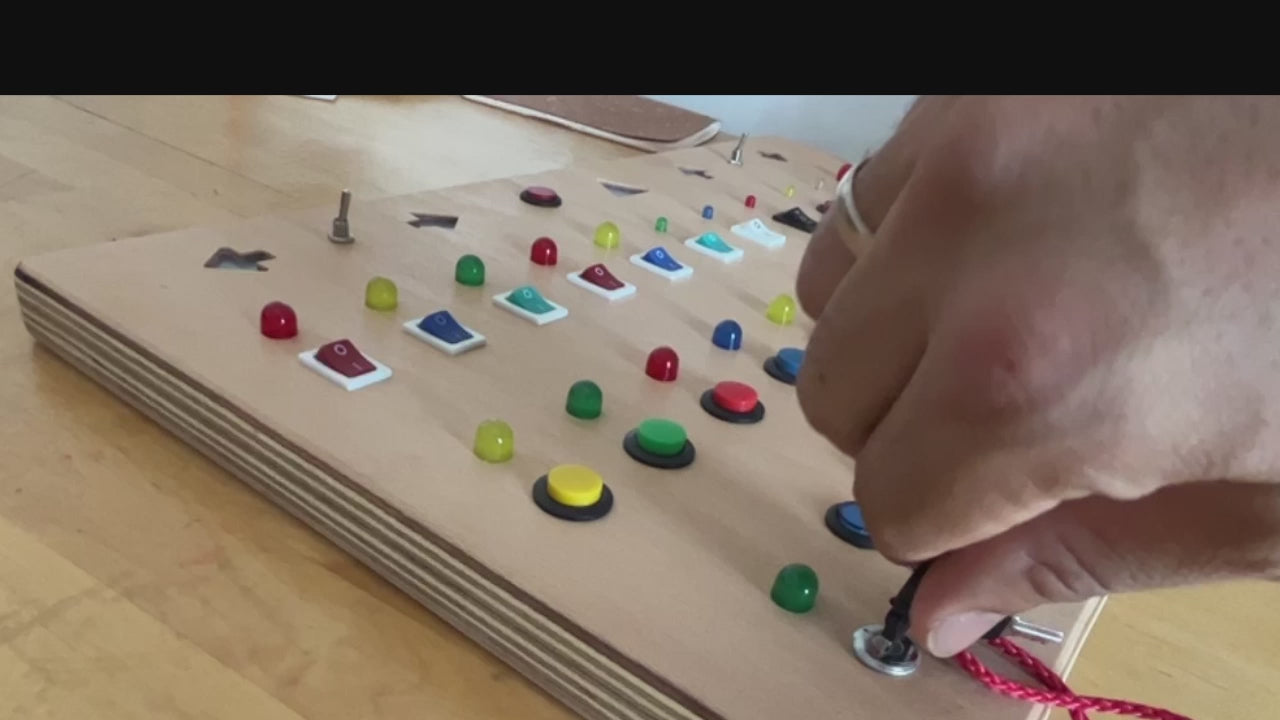 Handmade mega size busyboard for toddlers. Toddler room play desk montessori toy for light switch button obsessed toddlers with buzzer sound and RGB led lights.